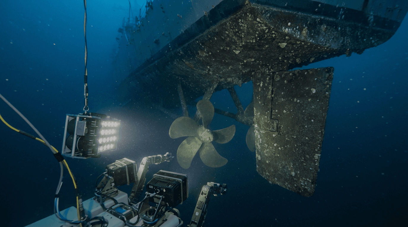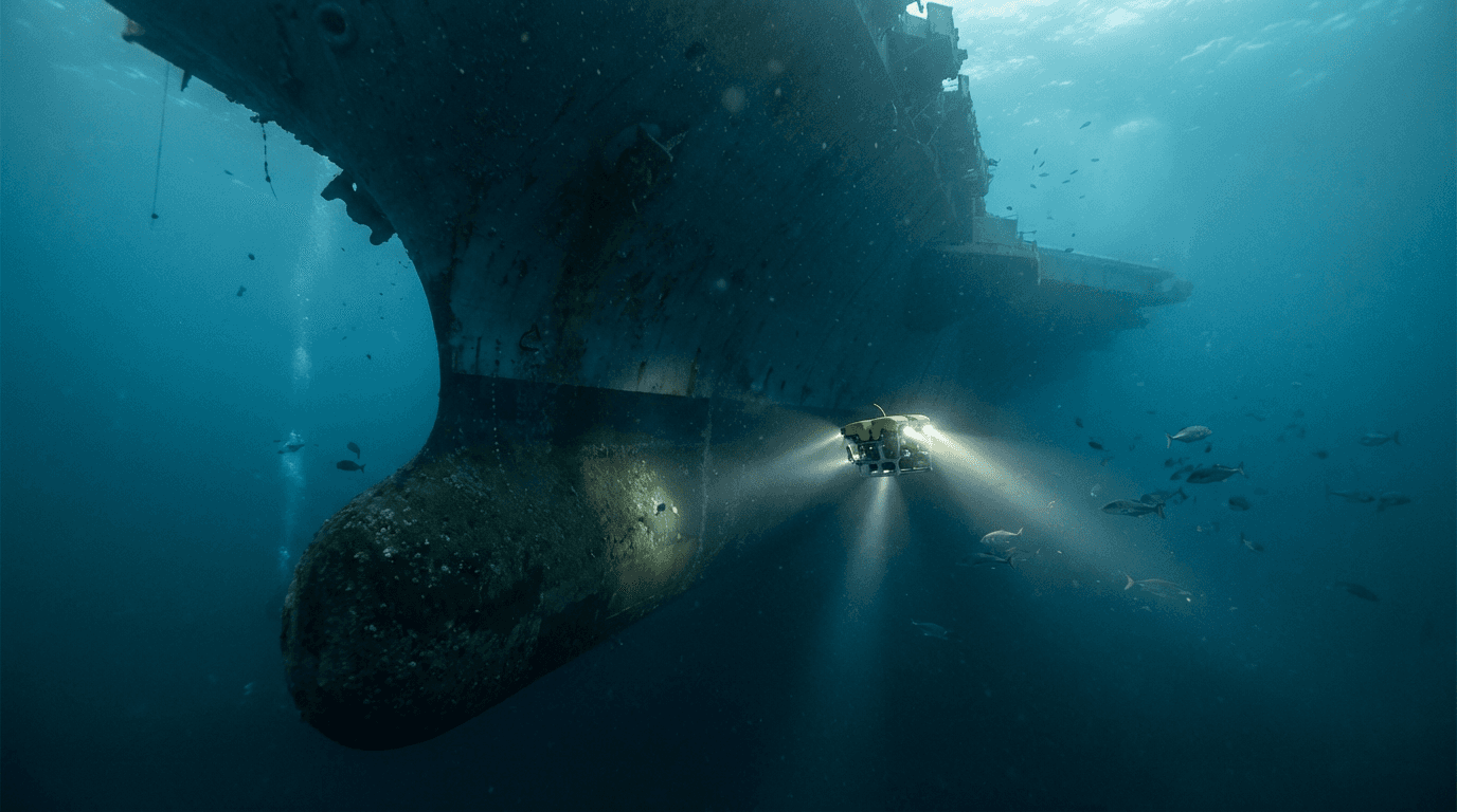 AI video analysis. Every frame analyzed for defects — corrosion, cracks, marine growth, CP degradation.